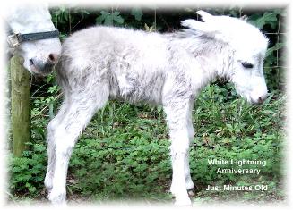 White Lightning Anniversary We were very blessed to witness his amazing birth, 45 minutes from start to stand! One of the blessings of selective, planned conception is knowing when to expect the miraculous birth! Born: June 11, 2005 Birth Height: 24" Color: Snow white Sire: Lawzyday's Farm's Sancho Panza, 32" Dam: SS Queenie, 33" (proven producer of white foals) Extended pedigree: The Fireman, Cochese, Black Hawk, Blackberry, Valentino 49 |