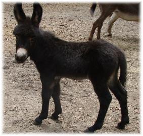 Rockette Born: March 18, 2009, Birth Height: 21", Jennet Color: Dark grey with red ears. I know it sounds unusual and it is! Rockette also has Jesus' gift of The Cross. "Special" is an understatement! Disposition: Smart and so people oriented, she could double for a puppy. Pedigree: Dam: Henson's Bambi #37570, 33", Spotted Dam's Sire: EA Spoletto, White Dam's Dam: Spotted Acres Pauline Dam's Disposition: Sweet but pushy for attention. She has been known to step on feet to get it! Sire: Lawzyday Farm's Sancho Panza, Chocolate, 32" Sire's Sire: Laughlin's Cochese, Red Sire's Dam: LDF Violet, 32", Dark brown Grandsire: KDL Black Hawk, 32" Black w/cross Greatsire: River's Crest Blackberry, 32" Black Sire's Disposition: Sweet and helpful! The best daddy donkey in the whole wide world, according to his owners -- That would be Us! Sancho Panza is from a long line of proven quality, color, and originality: The Fireman, Sorrel, Grumpy, LCR Valintino 49, Sorrel (from the 1920s original imports), RC's Merlin, Black Rockette's Body characteristics: Beautiful head and round buttocks from her Mama. Correct, attractive build from her Daddy Offered as wonderful, life-long pet or correct, pedigreed breeding quality jennet. Congratulations to his proud new owners, The Guinn Family |